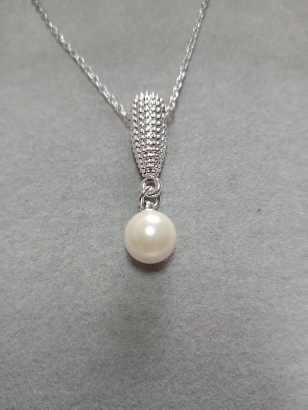 Цепочки на шею с подвеской жемчужины, серебристого цвета. В подарочной упаковке. Общая длина 22,5 см, длина цепочки 40 см + 9,5 см дополнительные звенья. Длина кулона 2,5 см, диаметр жемчужины 0.7 см.
