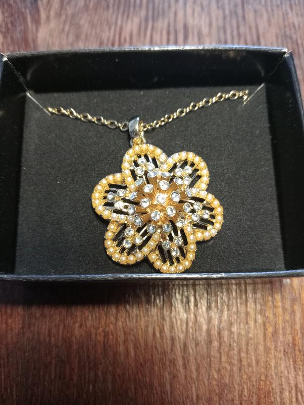 Украшение на шею с подвеской в форме цветка, длина цепочки 400 мм, дополнительные звенья 90 мм, диаметр подвеса 20 мм. Бижутерный сплав. В подарочной упаковке.
