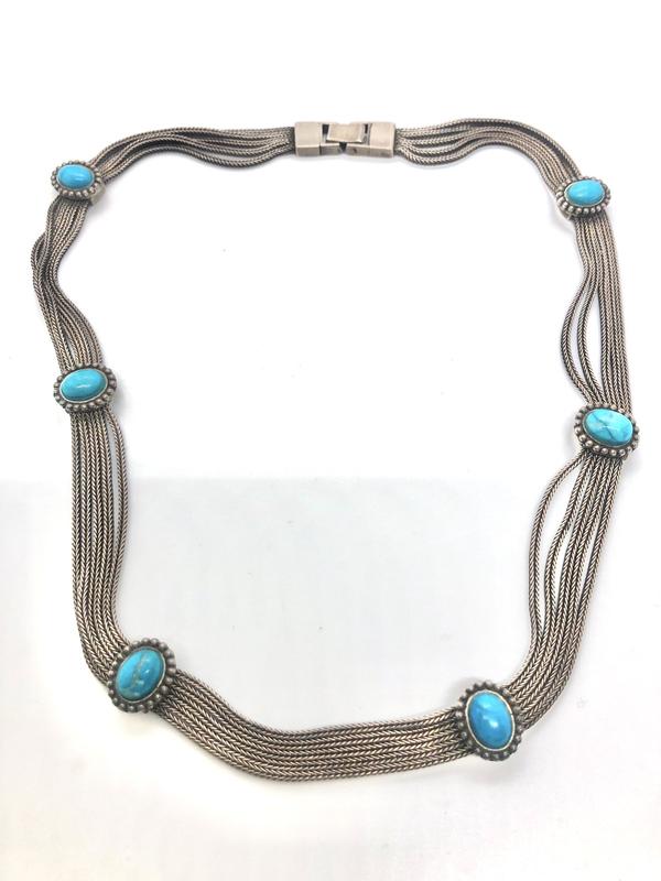 Ожерелье сделана в выде тонких цепочек украшенно бирюзой. Производство Европа, материал серебро 925’., застежка, 6 камней. Смотрится очень красиво, нарядно. Вес 40 гр.
