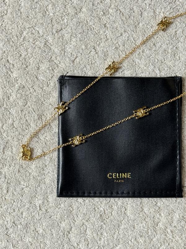 Дозвольте собі відчути преміум якість за доступною ціною✨✨✨ Кольє у стилі Celine Triomphe з латуні із золотим покриттям Елегантне кольє яке доповнить будь який образ Є 3 застібки які дозволяють регулювати довжину Матеріал: латунь із покриттям золота 18К Загальна довжина 45 см Комплектація: брендований шкіряний чехол для прикрас (на фото)