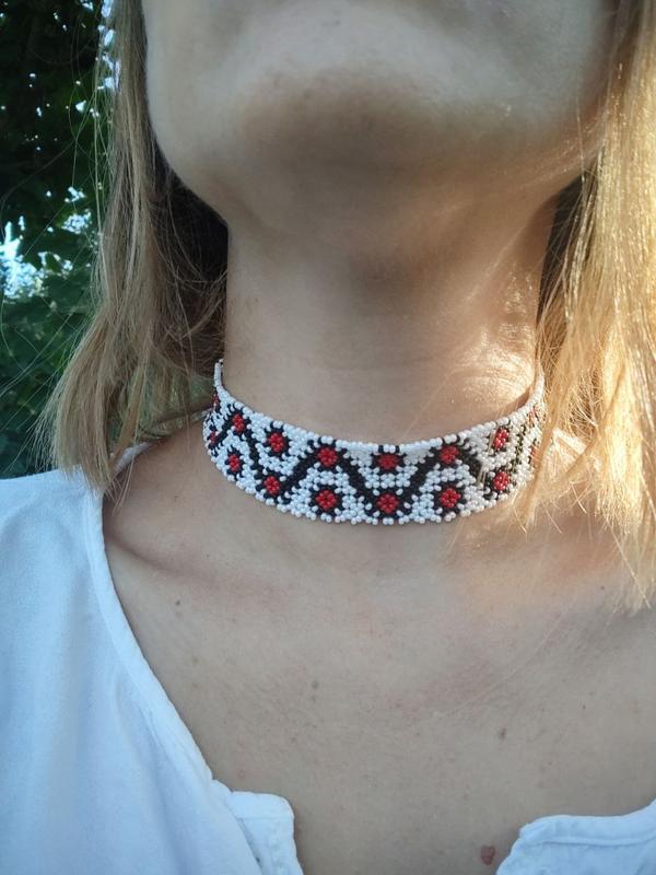 Лаконичный и стильный чокер из бисера в сочетании классических цветов. Отлично подойдет, как к деловому костюму так и к повседневной одежде. Длина - 31.5см и 35см завязки, как позволяют регулировать длину и удобно зафиксировать украшение Ширина - 3 см