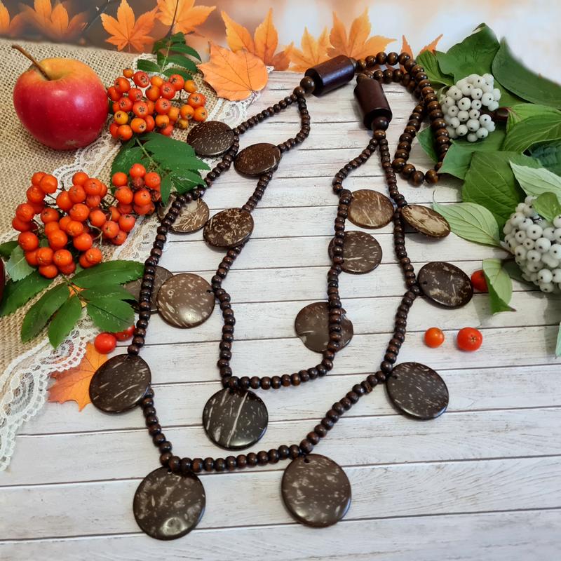 🔥🔥Подписывайтесь на наши обновления!! Добавляем украшения каждый день. 🔥 🕸🌴 Многорядное оригинальное колье "паутинка" с натуральными кокосовыми дисками коричневого цвета и деревянными бусинами. В этом колье 2 нити с бусинами. Колье без застежки, легко надевается через голову. Колье собрано на нитку. Красиво смотрится под вышиванку, создает яркий изысканный акцент. Размер: длина 100 см, размер бусин 6,8,10 мм, дисков 3 см. Состав: натуральные кокосовые диски, дерево, текстиль.