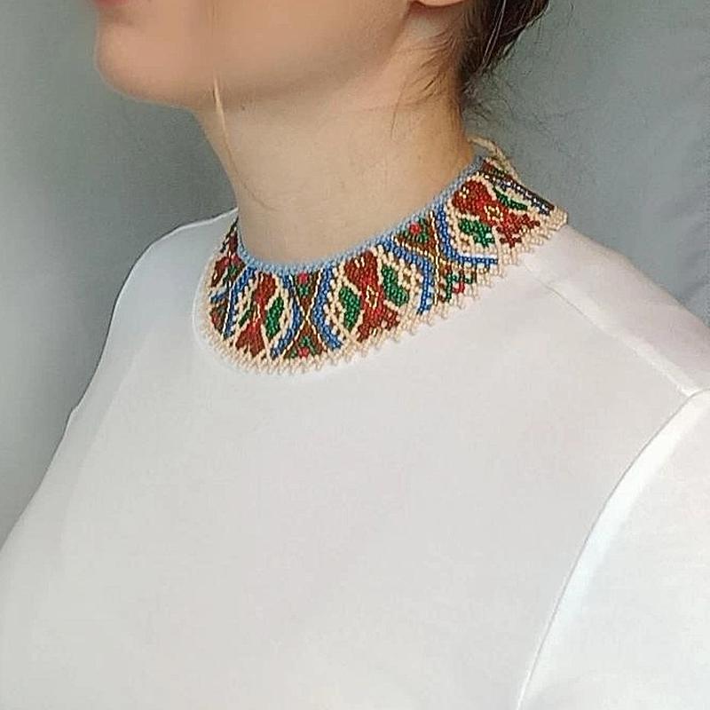 По заказу Украшение "воротник" на шею из бисера в украинском стиле! Ширина плетения 7см Обхват по шиї 34см Длину удобно регулировать шнурами. Сверхсилаю в хорошей упаковке. Есть возможность добавить открытку с персональным приветствием! Красивая идея для подарок женщине / девушке! Можно носить как дополнение к вышитой рубашке, так и как отдельный аксессуар в повседневных образах. При осторожном пользовании это украшение можно передавать от поколения к поколению! Без торгу! Возможно изготовление по заказу в других цветах, например традиционные красно-бело-черный. Звертайтесь.
