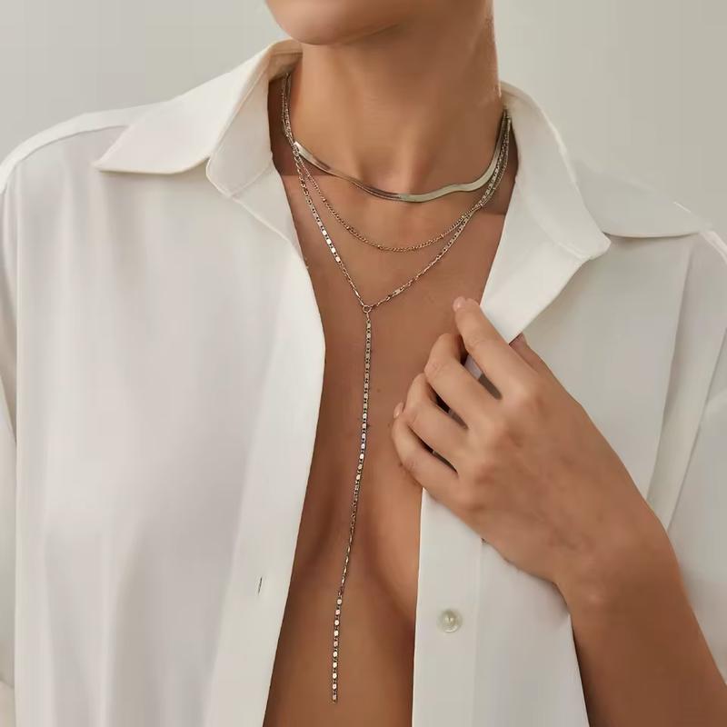 Акция! БЕСПОЛЬЗОЧНАЯ ДОСТАВКА при заказе бижутерии на сумму от 1000 грн. (до отделения почты или поштомат) 😉 Акция действует при оплате на реквизиты Многослойный комплект серебристых цепочек разных форм и фактур. Короткий широкая цепь короче, в то время как длинная цепочка с кулоном дополнительно удлиняет силуэт и добавляет современный шарм. Такой гарнитур уместно смотрится как в деловых, так и в вечерних образах.