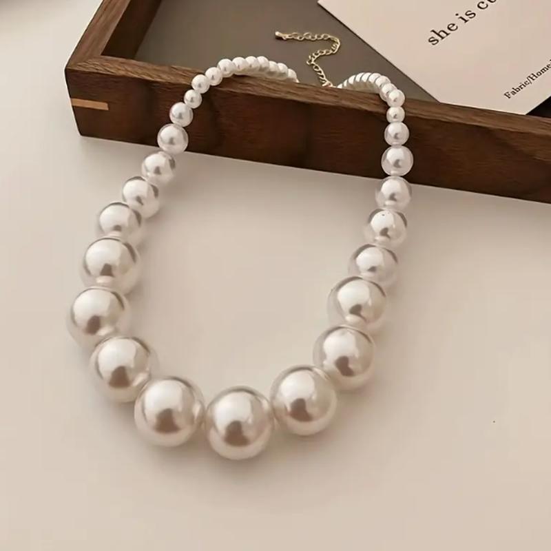 Ожерелье чокер с имитацией жемчуга Стильная бижутерия Жемчуг снова в моде! Массивность аксессуара в моде! Универсальное ожерелье под любой люк Белый цвет Бусины разных размеров длинна колье - 35+9 см самая большая бусина 1.7 см в диаметре самая малая бусина 0.8 см в диаметре
