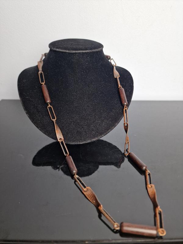 Винтажные бусы ручной работы из натурального дерева и меди — стильный арт-аксессуар, который создаёт эффект ручного ремесла и настоящего этно-шика. Тёплые деревянные цилиндры сочетаются с медными звеньями необычной формы, выполненными с красивой текстурой «чеканки». Медь имеет природную винтажную патину, благодаря которой украшение выглядит благородно и атмосферно. Ожерелье отлично ложится поверх свитера, платья, рубашки — добавляя образу глубину и индивидуальность. Такой аксессуар любят стилисти й колекционери. Материалы: натуральное дерево (твёрдая порода), медь. Состояние: отличное винтажное. Длина от начала до конца 78 см. Идеально подойдёт для любителей бохо, этно, винтажа, hand-made эстетики.