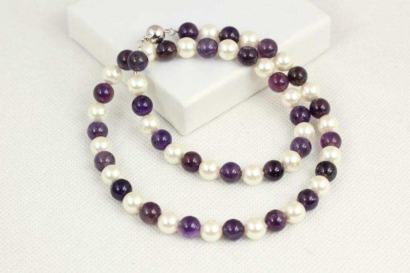 Бусы No name с аметистом и жемчугом shell серебристый длина 48 см диаметр шариков 8 мм