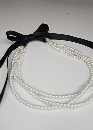 Колье с перлами с завязками в элегантном сдержанном стиле. Жемчужинки стеклянные с напылением. Лента репсовая черного цвета. • Длина ряда с перлами - 33 см • Длина ленты - 35 см • Фурнитура люкс латунь с напылением 18k Цена - 550 грн Доставка возможна: Укрпошта Нова Пошта