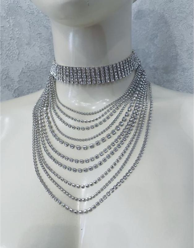 Шикарное многорядное колье чокер со стразами!!! В реале намного круче, чем на фото! Ширина верхнего чокера - 1,9 см Обхват по шее - 30,5 см (+ 8,5 см удлинительная цепочка) 13-6-4П