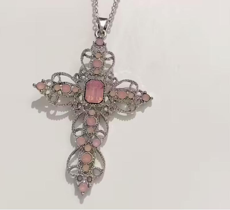 Цепочка серебристого цвета с подвеской крест с розовыми камушками