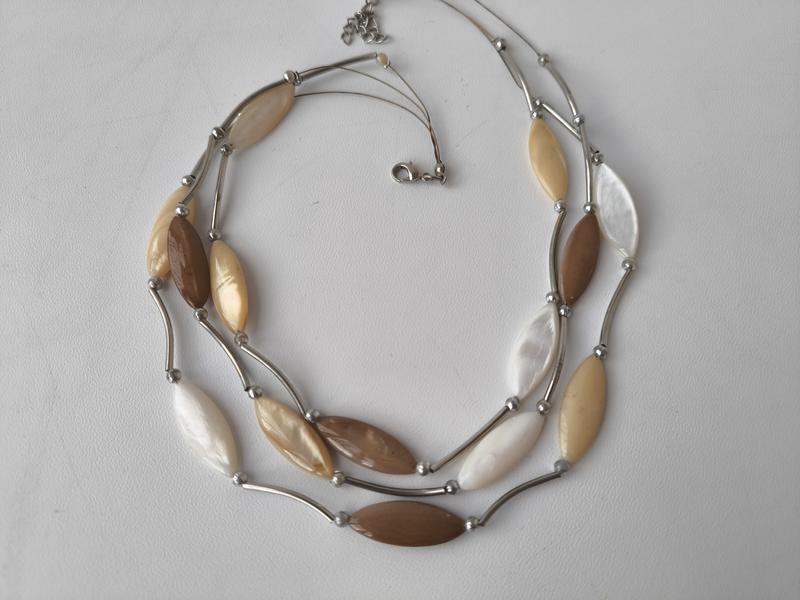 Интересное украшение, ожерелье Предположительно перламутр длина 42 см + 6 см цепочка удлинитель ширина 1 см (одной нити) б/у, в хорошем состоянии, незначительные потемнения цепочки возле замочка (на фото не удается передать)