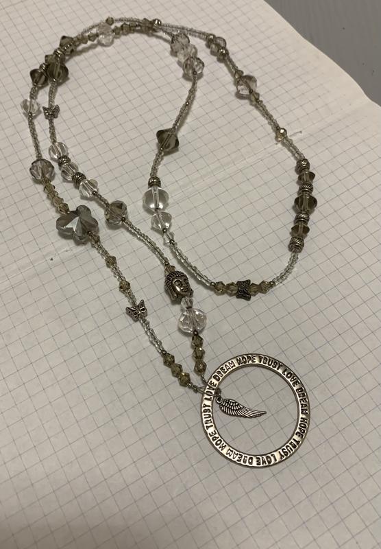 Це довге намисто або намисто з біжутерії з кристалами, бісером, металевими намистинами і підвісками-метеликами. На підвісці. На ній написано: « Надія, Довіра, Любов, Мрія»Довжина - 86 з кулоном. Питайте…