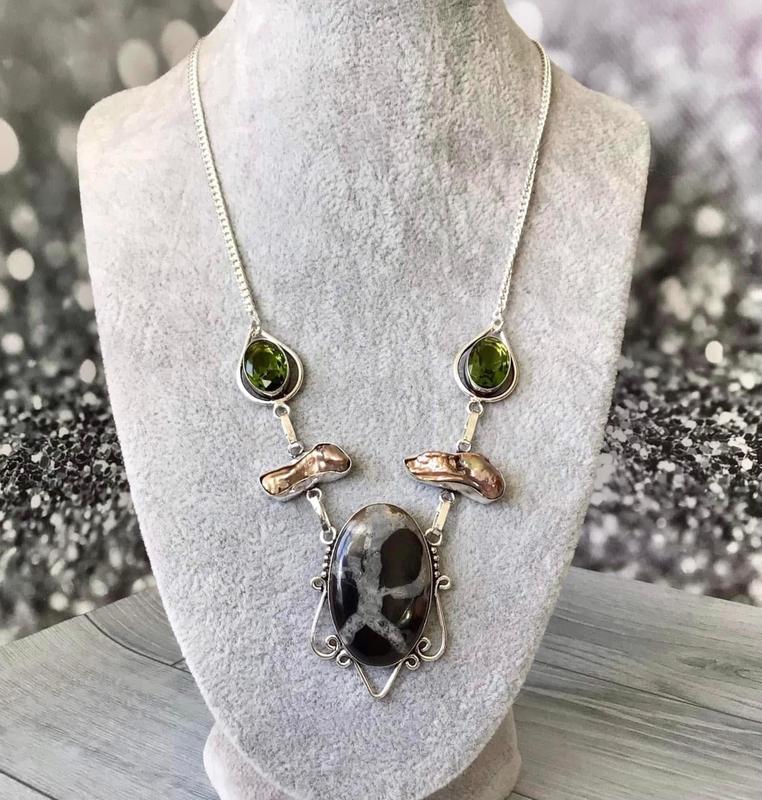 Уточняйте наличие товара. Индия, Колье с сертариями, жемчугом Бива и кварц перидотами, длина 51 см «Сердце Дракона» с септарией, жемчугом и перидотом Это колье - настоящий шедевр, созданный самой природой. В центре композиции - редкая, почти черная септария, известная как «камень дракона». Ее уникальность заключается в глубоком, темном оттенке, который не часто встречается, и невероятных узорах - словно трещины, заполнены полупрозрачным светлым кварцем. Этот камень излучает первоначальную силу и могущество. По обе стороны от центральной септриарии нежность и тепло добавляют две жемчужины бива, обладающие благородным цветом кофе с молоком. Их мягкое сияние гармонично контрастирует с характером основного камня. Довершают колье изящные, сверкающие кварцы-перидоты, словно первая свежая зелень после дождя, добавляя украшения яркости и жизненной энергии. Это колье – не просто аксессуар, а глубоко символичный предохраняющий в себе мистическую силу земли, нежность жемчужин и обновление природы. Оно станет уникальным украшением, которое подчеркнет ваш изысканный вкус. Все украшения из Индии изготавливаются вручную мастерами. Основа - низкопробное серебро, покрытие - слой серебра 925. Примечание - натуральные камни могут иметь включения, микровыемки, шероховатости природного характера и неровности геометрии. Предоставляются максимально корректные фото изделия. Вы получите именно то изделие, которое на фото, в надежной упаковке! Доставка: ПІСЛЯПЛАТИ НЕМАЄ. Оплата на карту Приват банка или Монобанку Отправка по Новой почте или Укр-почтению