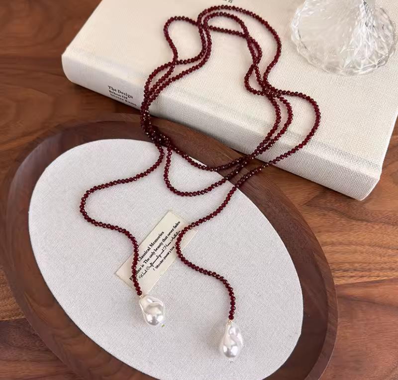 Акция! БЕСПОЛЬЗОЧНАЯ ДОСТАВКА при заказе бижутерии на сумму от 1000 грн. (до отделения почты или поштомат) 😉 Акция действует при оплате на реквизиты Изысканное долгое украшение на шею выполнено из мелких бордовых бусин, которые образуют гибкую «нить», легко завязывающуюся узлом или намотываясь в несколько оборотов, создавая разные варианты посадки. На концах расположены объемные жемчужные подвески в виде капель, которые мягко двигаются при ходьбе и добавляют образу элегантности, особенно в сочетании с однотонными сулеками, рубашками с глубоким вырезом или базовыми топами