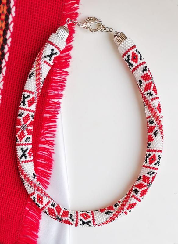 Жгут, связанный из чешского бисера в стиле вышиванка. Классические оттенки издавна символизируют жизненную силу, чистоту и мудрость, а каждый элемент узора несет в себе глубокий символизм и гармонию. Это украшение станет не только стильным дополнением Вашего образа, но и мощным оберегом. Позвольте себе прикоснуться к культурному наследию через этот утонченный аксессуар. Длина с застежкой ок.44см, возможно продлить цепочкой,