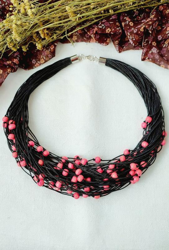 Колье выполнено из экологичных материалов: хлопкового вощеного шнура, деревянных бусин, застежка из латуни. Ожерелье приятное на ощупь, легкое, подходит к этности одежды, а также подойдет к сарафану, платьям, майке или футболке.