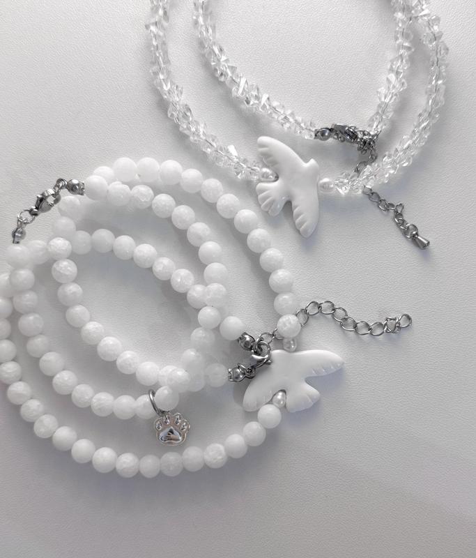 Намисто чокер з пташкою (з горлицею) кришталь / нефрит / білий матовий агат