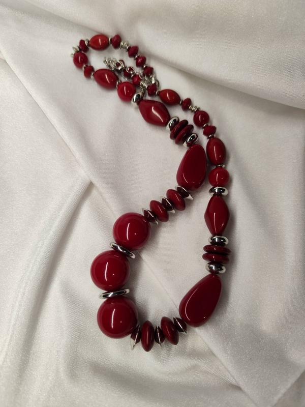 Яркое ожерелье насыщенного вишневого цвета. Длина 50 см + 8см дополнительно. Легкое приятное к телу, подходит как к классическому так и к этническому стилю. Яркий и стильный аксессуар к любому образу.