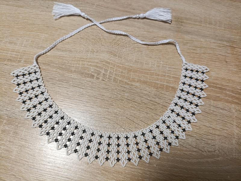 Витончена класична силянка, створена з перламутрово-білих та чорних бісеринок у геометричному узорі. Якісне плетіння та елегантний дизайн роблять цю прикрасу ідеальним доповненням до класичного та офісного стилю. Особливості: • Перламутрово-білі та чорні бісеринки • Регулювання довжини завдяки китицям • Геометричний орнамент • Універсальний дизайн Розміри: • Довжина силянки: 36 см • Ширина: 4 см • Довжина китиць: 25,5 см кожна Прикраса ідеально поєднується з класичним одягом та офісним стилем, додаючи образу витонченості та елегантності.