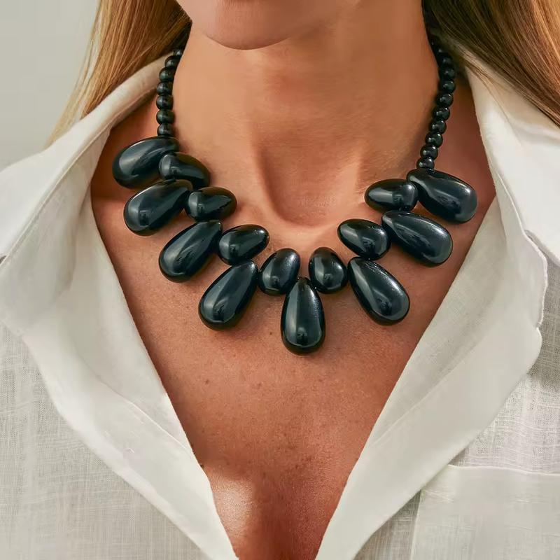 Колье с большими черными бусинами-капли в глянцевом оттенке