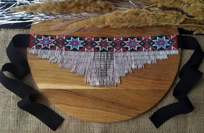 Гердан ленточный с подвесами из скляруса и металлических элементов, по схеме гердана середины ХХст. (Коломойский р-н, Ивано-Франковская обл.) из книги Олены Федорчук "Украинские народные украшения из бисера", длина бисерной части 27.5см, ширина 3см (с подвесами - самая длинная часть 9.5см), длина хлопковой ленты 1м, выполнена из качественного чешского бисера и скляруса Preciosa, подарочная упаковка и мешочек для хранения украшения