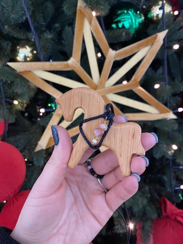 Деревʼяний коник, підвіска на шию. Розмір 7 см. Ручна робота. Декоровано натуральним камінням.