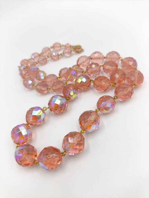 Винтажные бусы гранёное стекло с покрытием Состояние б/у. хорошое, могут присутствовать следы использования (потёртости/патина/микросколы) Бусы крупные, бусины от 15мм. до 6мм. Приблизительная длина 60см. Яркий аксесуар в вашу коллекцию