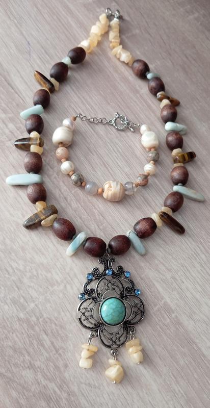 Бусы в стиле бохо с подвеской под бирюзу. Намистины из темного дерева дополни натуральным камнем (амазонит, тигриный глаз и желтый кальцит). браслет на мемори проводе с натуральным камнем (мраморный оникс, жемчуг и агат).