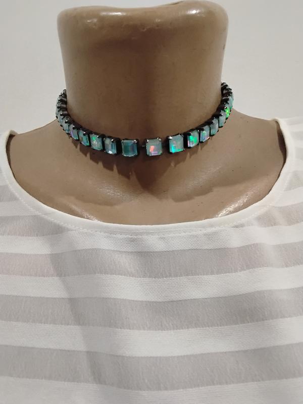темнуватість на 2-камінцях,дивись фото довжина -40см повна від краю до краю ірисоване скло -більш підходить цьому чокеру