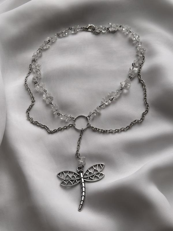 • Изысканное ожерелье из натурального горного хрусталя и центральным акцентом – изящная подвеска в виде бабки. • Длина изделия 36 см(+5 см удлиняющая цепочка)