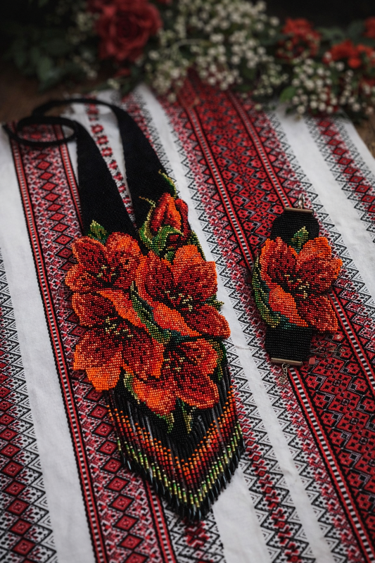 Украшение выполнено из чешского бисера высшего сорта и стеклянных бусин, по желанию браслет. Размер гердана в длину от середины пояска до низа низочек 59 см, в кулоне ширина 13см, размер браслета длина на руку 17-18см, ширина7см.