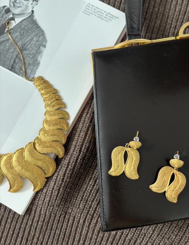 Ох, який характерний сет 😍 Він прямо дихає 80-ми — зухвалий, золотий, впевнений-1250📮 ✨ Вінтажний сет: чокер + сережки Ефектний чокер довжиною 45 см, що красиво лягає по лінії ключиць. Складається з рельєфних хвилястих елементів із фактурною поверхнею — кожна деталь нагадує золоті пелюстки або стилізовані пера. Завдяки цьому прикраса виглядає об’ємною та дуже статусною. Сережки ідеально підтримують дизайн — ті ж вигнуті форми, гармонійна симетрія та виразний блиск теплого золота. Разом вони створюють завершений, продуманий образ. 💛 Колір — насичене тепле золото 💛 Стиль — вінтаж / statement 💛 Настрій — впевненість, жіночність, арт-шик Такий сет стане акцентом навіть до простого чорного гольфу чи білої сорочки — він сам «робить» образ. Ідеальний для вечора, фотосесій або якщо хочеться відчути себе трохи іконою стилю.