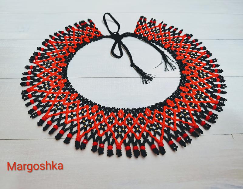 Изысканная силавка, которая красиво дополнит образ в украинском стиле. Изготовлена из чешского бисера и стеклянных бусин. Ширина 4.5 см. Довжина 38 см.