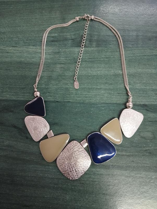 колье с эмалью синего и бежевого цветов. основание серебристого металла. длина 45+10 см.