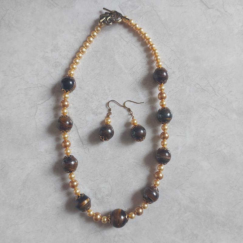 набор колье и серьги с натуральными уканьем тигровой глаз