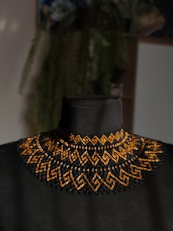 Предлагаю украшение из бисера, она как бы то и простая, однако этот узор меандр - это древний геометрический орнамент в виде непрерывной ломаной линии, символизирующей воду, вечность, гармонию и порядок. В большинстве он ассоциируется с греческой Грецией. Но в Украине он имеет глубокие корни: древнейшее изображение (около 18000р. до н.э.) найден на костяном браслете возле с.Мизин на Черниговщине. Данный мотив используется в вышивке и народном искусстве. Украшение свободное, ищет свою обладательницу ✨