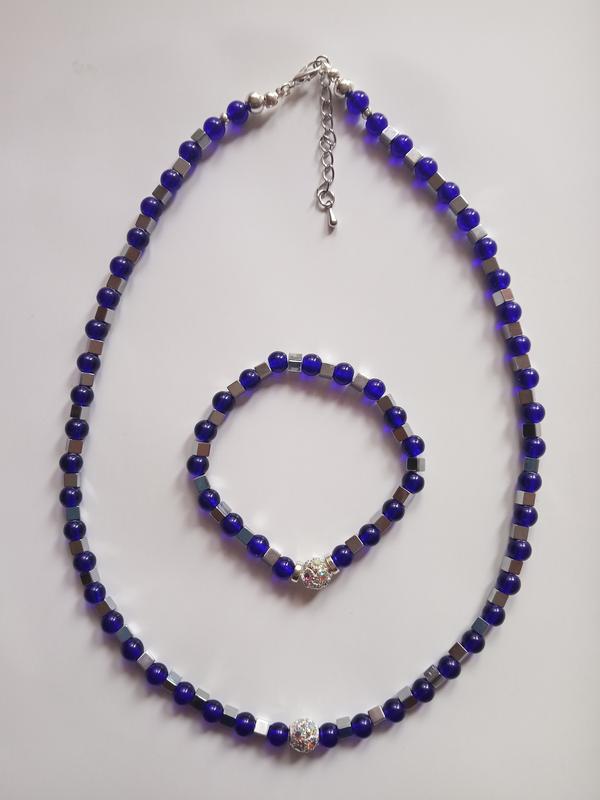 Бусы и браслет из синего агата и гематита.