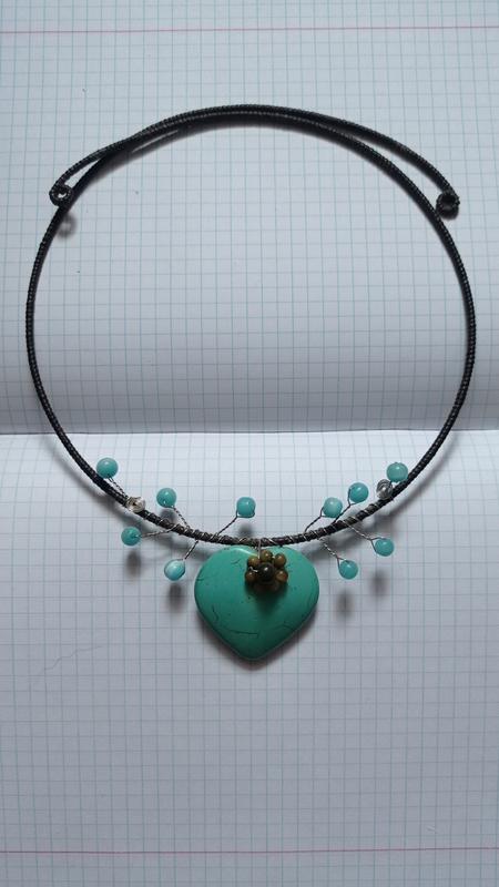 Оригинальное авторское украшение на шею. Выполнена в технике плетения проволокой (wire System) с использованием натуральных камней и качественной фурнитуры. Характеристики: Материал кулона: Камень (прессованная бирюза/голлит), форма - сердце. Основа: Чокер-обруч черного цвета, регулируется по объему. Декор: Голубые бусины на металлических веточках, акцентный цветок из мелких бусин по центру. Состояние: Новый / Отличный (как на фото). Необычный, привлекающий взгляды дизайн. ВНИМАНИЕ! Укрась только "продавцу на карту".