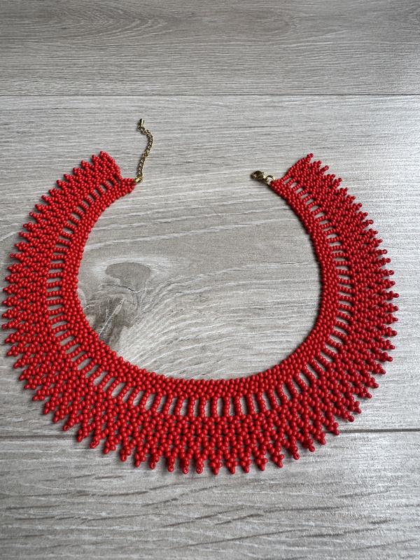 Ефектне кольє з бісеру ручної роботи Стильне та яскраве кольє з червоного бісеру, виконане вручну. Чудово доповнить як святковий, так і повсякденний образ. Легке, зручне у носінні, не обтяжує шию. Надійна застібка з подовжувачем дозволяє регулювати довжину. Матеріал: якісний бісер Колір: насичений червоний Застібка: металева з подовжувачем Ручна робота Ідеальний варіант для подарунка
