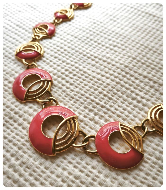 Винтажное колье в золотистом металле с коралловыми вставками ✨ Эффектное винтажное колье с оригинальным дизайном – сочетание золотистого металла и ярких кораллово-розовых эмалевых элементов. Ланки имеют стильную геометрическую форму, что создает очень элегантный и современный вид, несмотря на винтажный стиль. 🔸 Состояние: очень хорошее винтажное состояние 🔸 Материал: металл золотистого цвета, эмаль 🔸 Цвет: золото + кораллово-розовый 🔸 Дизайн: объемные декоративные звенья с ажурными элементами 🔸 Подойдет как к повседневному образу, так и для особых событий