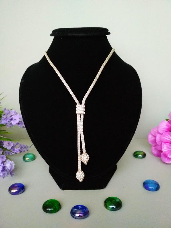 Элегантное и нарядное ожерелье. На концах цепочки утяжелители круглой формы с камушками. Аксессуар имеет застежку карабин и цепочку для регулировки ширины. Длина: 28 см.