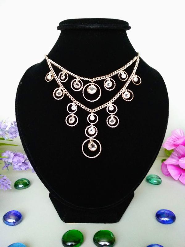 Утончённое двойное ожерелье с камушками. Украшение имеет застежку карабин и цепочку для регулировки ширины. Длина: 42 см.