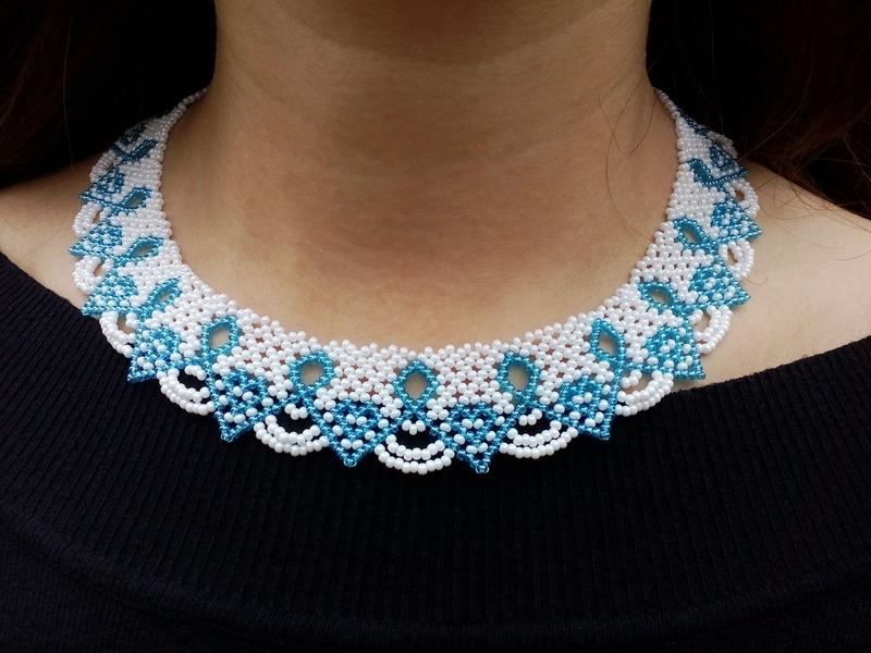 Элегантное колье с сердечками выполнено из чешского бисера. Длина: 44 см + 5 см. Цвет: белый, голубой Бисер: Чехия. Замок: карабинчик