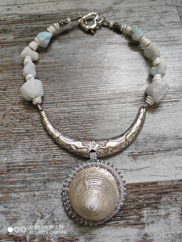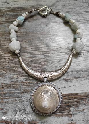 Натуральная ракушка,бисер,друза флюрита.Очень стильная и необычная вещь, выполненная с душой.В подарок кольца с такой же ракушкой