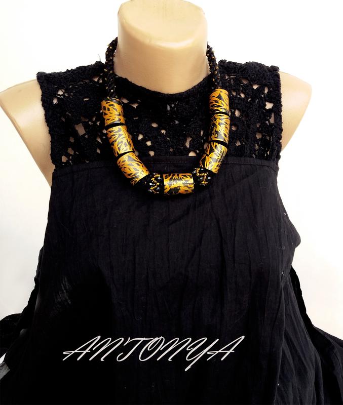 Колье с бусинами-цилиндрами выполнено из запекаемой полимерной глины в стиле Бохо. Классическое сочетание черного и золотого позволяет носить колье с блузами и платьями. Колье украшено бусинами и бисером. Колье собрано на шнуре , длина -47 см плюс удлинительные колечки.