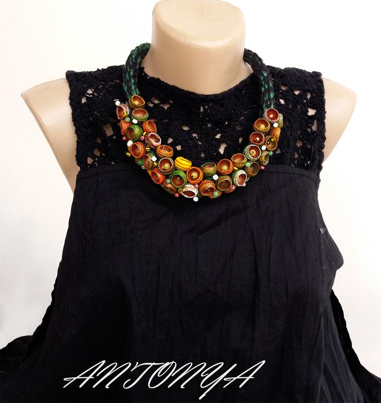 Колье выполнено из запекаемой полимерной глины в технике Рваный край. Красивое и стильное колье с полыми бутонами выполнено в бохо стиле, шнур выполнен в технике кумихимо. Длина колье 46 см плюс удлинитель. Колье красиво ложится и отлично гармонирует с любым видом одежды. Оригинальный и стильный подарок любимой девушке, жене, подруге, сестре на день рождения, на годовщину свадьбы, на юбилей, на 8 марта. Необычный подарок, дизайнерское украшение, эксклюзивный подарок, авторское украшение