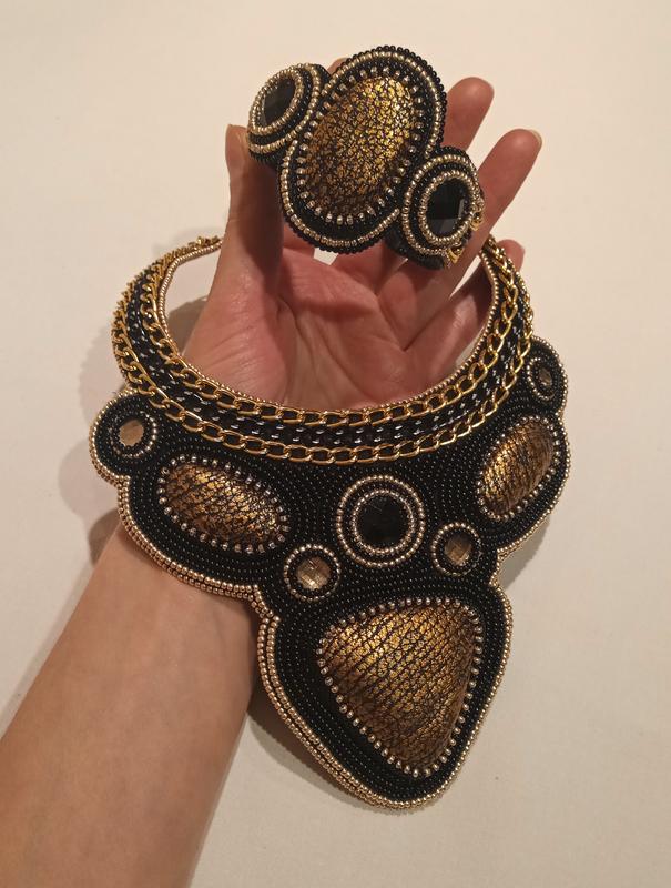 Кольє вишита чеським бісером і ланцюгами в чорно-золотих тонах,виворітна сторона обшита найбільш м'якої італійською шкірою,центральні елементи ручної роботи (виконаний зі шкіри). Ціна за кольє.Застібку при необхідності удлиню або заміню на ланцюг і застібку лобстер(можливості для регулеровки довжини)