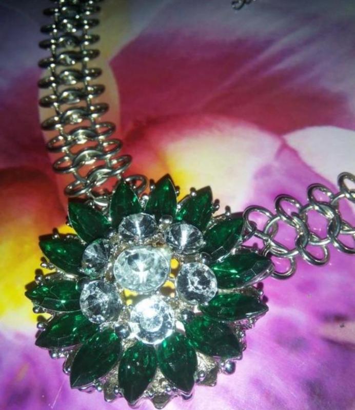 Шикарное сверкающее вечернее колье, камни в действительности более глубокого насыщенного изумрудного цвета. Очень красивое.