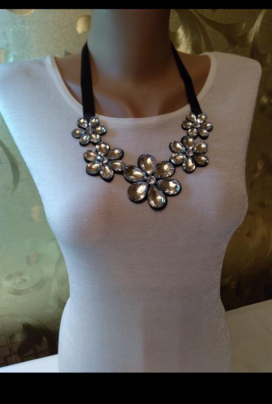 Очень красивое колье с зеркальными камнями дополнит любой наряд.Смотриться великолепно.длинные завязки помогут удобно расположить колье на декольте.