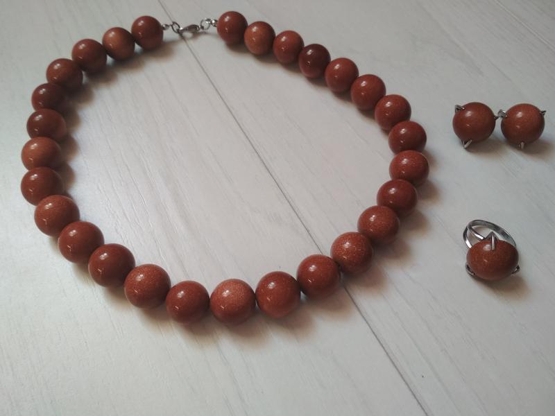 камень золотой песок.крупные бусы.серьги и кольцо тоже крупные оправа мильхеор.